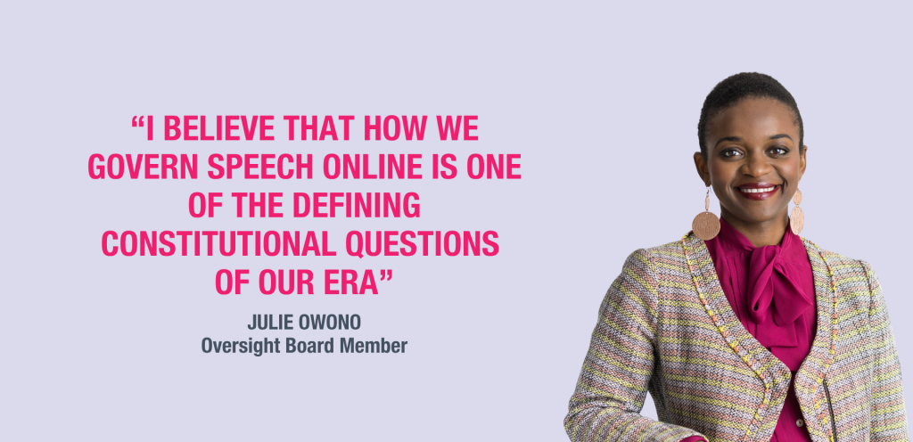 In the first of a Q&A series featuring insights and experiences from individual Oversight Board Members, we put the spotlight on Julie Owono, the executive director of Internet Sans Frontières and one of the founding members of the Board. Julie is also a researcher affiliated with the Berkman Klein Center at Harvard University and the University of California, Berkeley's Human Rights Center.